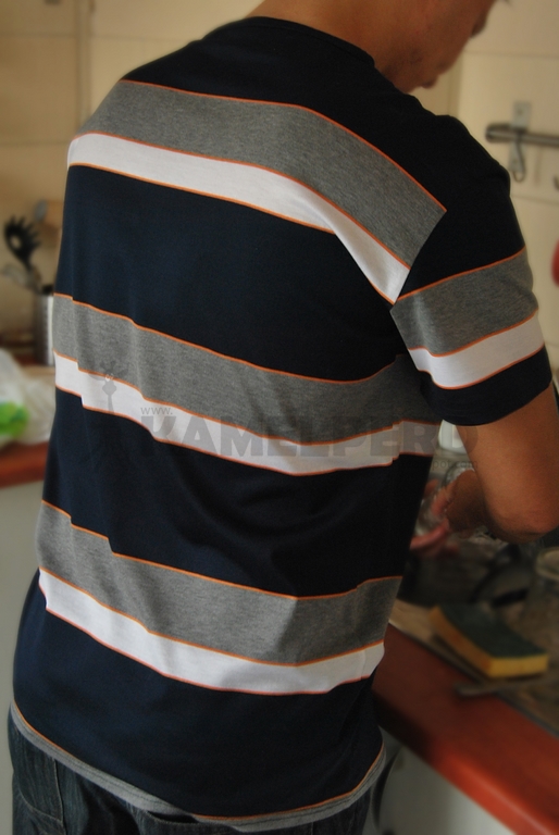 Koszulka męska z bawełnianej dzianiny - na początku miała być z długim rękawem, ale materiału miałam niewiele i jeden rękaw musiałby mieć paski wzdłuż a drugi wszerz, więc uszyłam z krótkim.